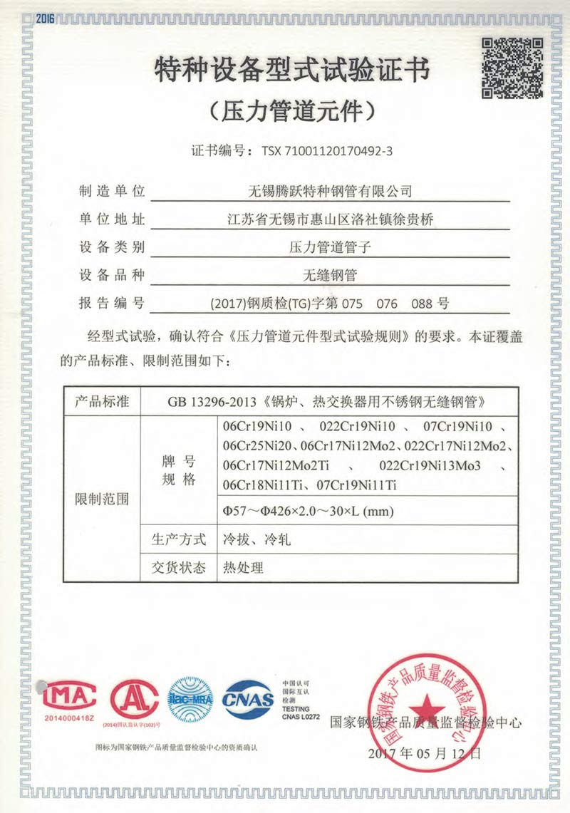 無錫騰躍特種鋼管有限公司創(chuàng)建于1987年,地處江蘇省無錫市惠山區(qū)洛社鎮(zhèn)。公司占地面積18萬平方米,現(xiàn)有員工350人,是一家專業(yè)生產(chǎn)不銹鋼無縫管的企業(yè),年產(chǎn)能5萬噸。主要規(guī)格:外徑6~630mm、壁厚0.7~40mm。主要材質(zhì):奧氏體、奧氏體-鐵素體、鎳基合金等。 公司是中石化、中石油、中海油、核電的供應商網(wǎng)絡成員單位,是江蘇省AAA級信用單位。公司先后通過ISO9001質(zhì)量管理體...